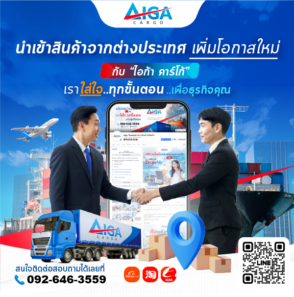 Aiga Cargo เราเป็นตัวแทนนำสินค้าจากต่างประเทศเข้ามาประเทศไทย และจัดส่งถึงมือลูกค้าที่หน้าบ้าน เรามีบริการนำเข้าสินค้าที่ครบวงจร ตั้งแต่ติดต่อโรงงาน ร้านค้า แหล่งขายส่ง มีเจ้าหน้าที่มากประสบการณ์ช่วยแก้ปัญหาและต่อราคากับร้านจีนให้ ไม่มีขั้นต่ำในการนำเข้า สินค้าเพียง 1 ชิ้นก็นำเข้าได้ คิดราคาตามจริง ไม่มีบวกเพิ่ม นอกจากนี้ เรายังมีระบบติดตามสถานะสินค้าที่ใช้งานง่ายและทันสมัยได้ตลอด 24 ชั่วโมง การขนส่งมีทั้งทางรถซึ่งใช้เวลาเพียง 3-7 วัน ทางเรือใช้เวลา 12-20 วัน และทางอากาศใช้เวลา เพียง 1 วันเท่านั้น